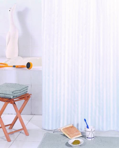 Занавеска из 100% полиэстера для ванны с 16 белыми люверсами под кольца. Цвет: ослепительно белоснежный с жемчужными полосками. Штора обработана специальной пропиткой, отталкивающей воду. Внизу по всей длине вшит шнур-утяжелитель.